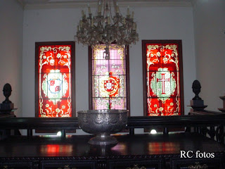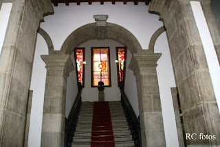 Ao cimo do primeiro lance de escadaria destacam-se os vitrais que representam, os laterais, a heráldica da cidade de Angra e, ao centro, o emblema nacional.